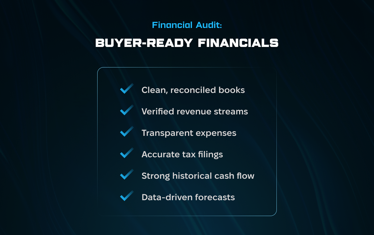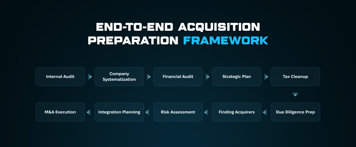 Проведіть внутрішній аудит, впорядкуйте фінансові звіти, вирішіть податкові питання, оцініть ризики, розробіть стратегічний план і сформуйте пакет документів для due diligence. Потім визначте потенційних покупців, підпишіть LOI та рухайтеся через повний процес M&A.