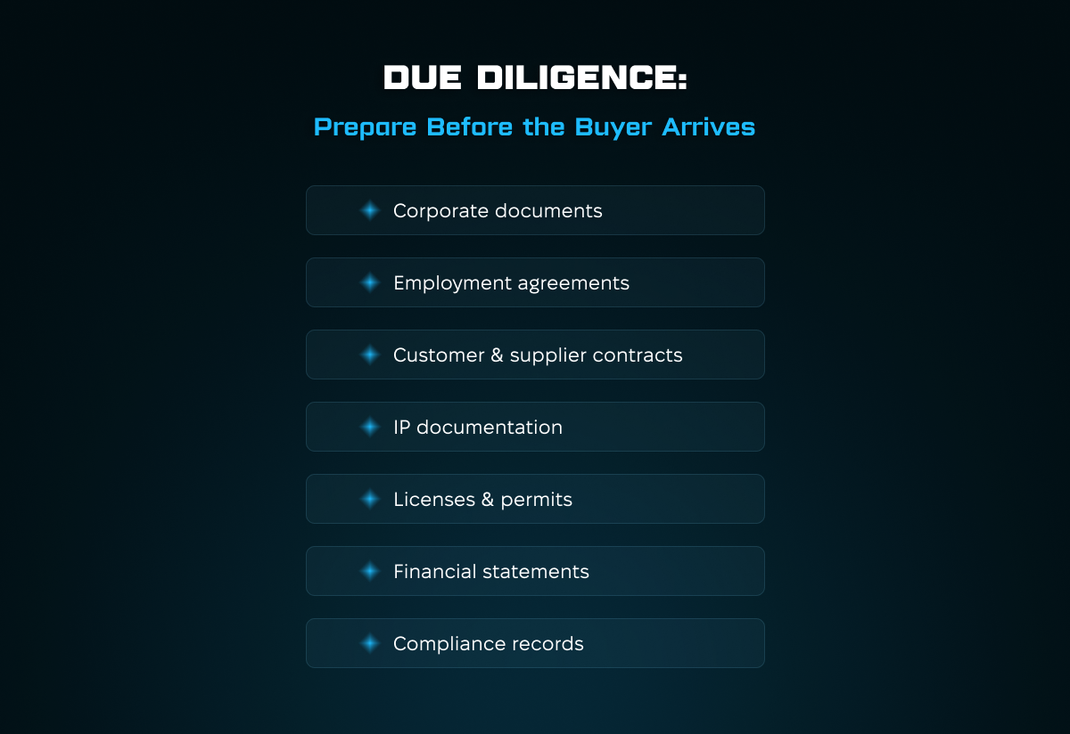 Рішення: впорядкувати всі документи, підтримувати їх актуальність і забезпечити легкий доступ для команди покупця на етапі due diligence.