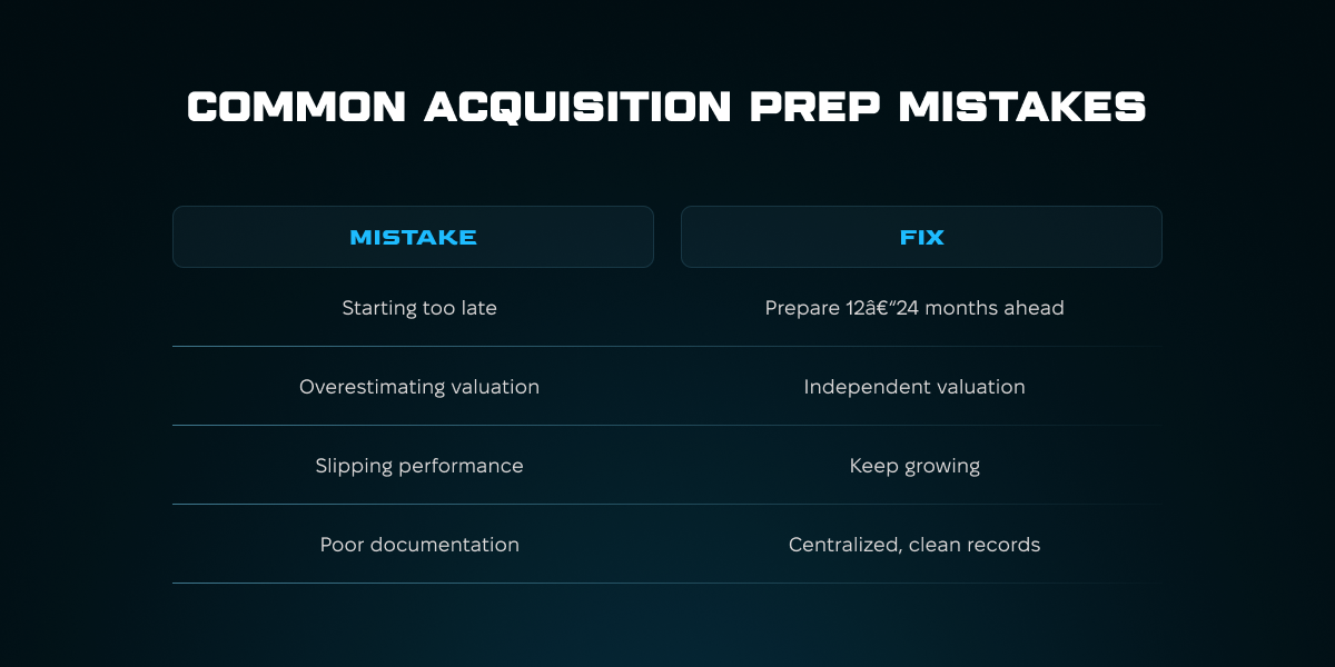 Основні ризики: слабка документація, завищені очікування щодо вартості, недостатня підготовка та зниження результатів під час переговорів. Уникайте їх, розпочавши підготовку завчасно, впорядковуючи записи, зберігаючи операційну ефективність і працюючи з консультантами.