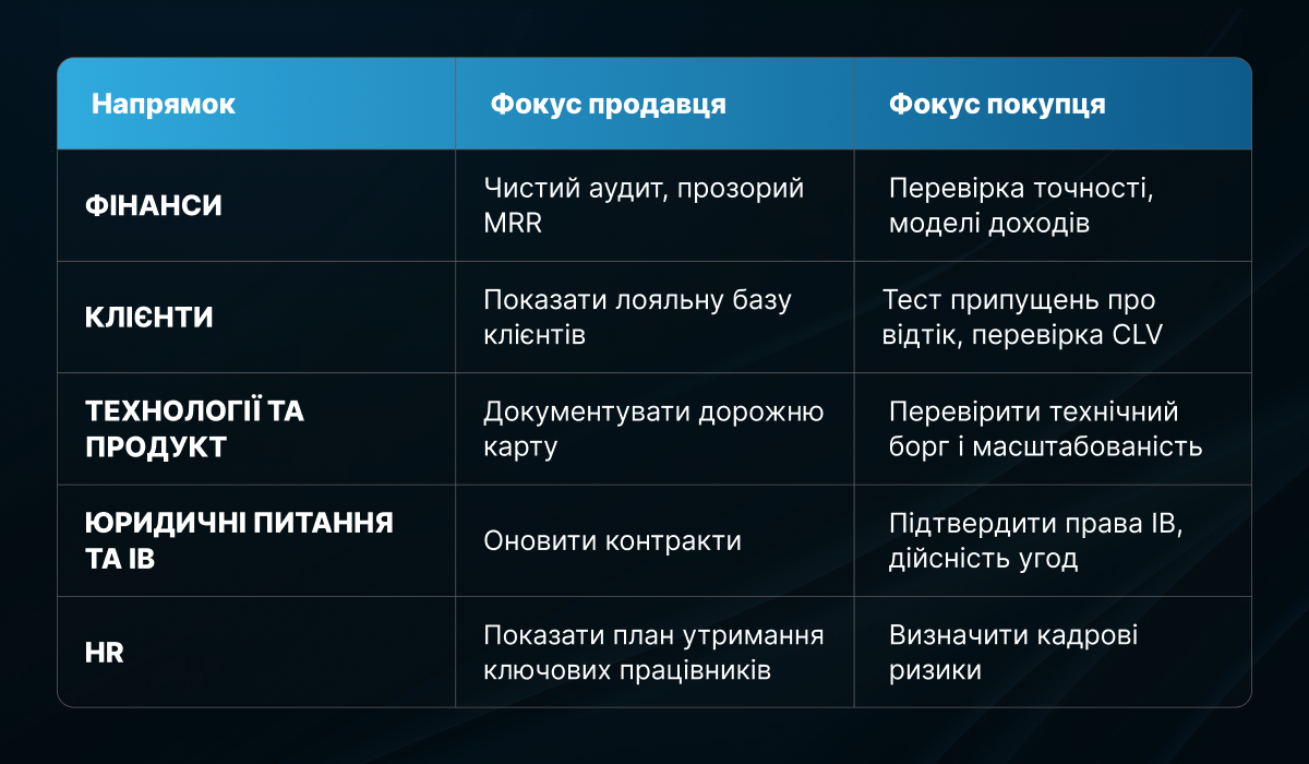 Покупцям потрібні докази, що регулярний дохід стабільний, відтік клієнтів під контролем, а ваш продукт не впаде під тягарем технічного боргу. Продавці ж повинні готуватися до due diligence заздалегідь, аби продемонструвати цінність і уникнути червоних прапорців в останній момент.